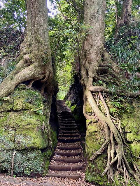 切り通しに足を踏み入れると、しっとりとした森のにおいがした。緩やかな勾配の階段になっていて、祭壇への細い通路を上がっていくような気分に。