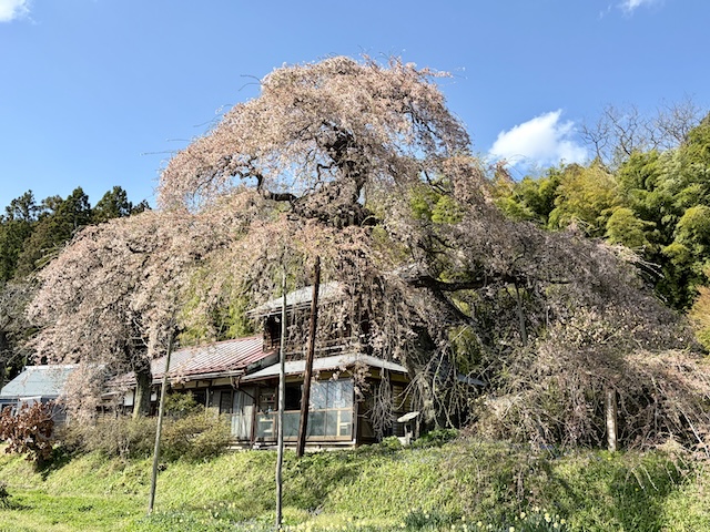 横田陣屋の御殿桜は、遠目にもよく目立つ。後ろに立つ古民家と相まって、絵本の世界のような里の風情を感じる。残念ながら、今日は七割がた散ってしまっていたが、すぐ隣に立つ、山から降りてきた巨大な祟り神のようにも見える枝垂れ桜に目を奪われた。
