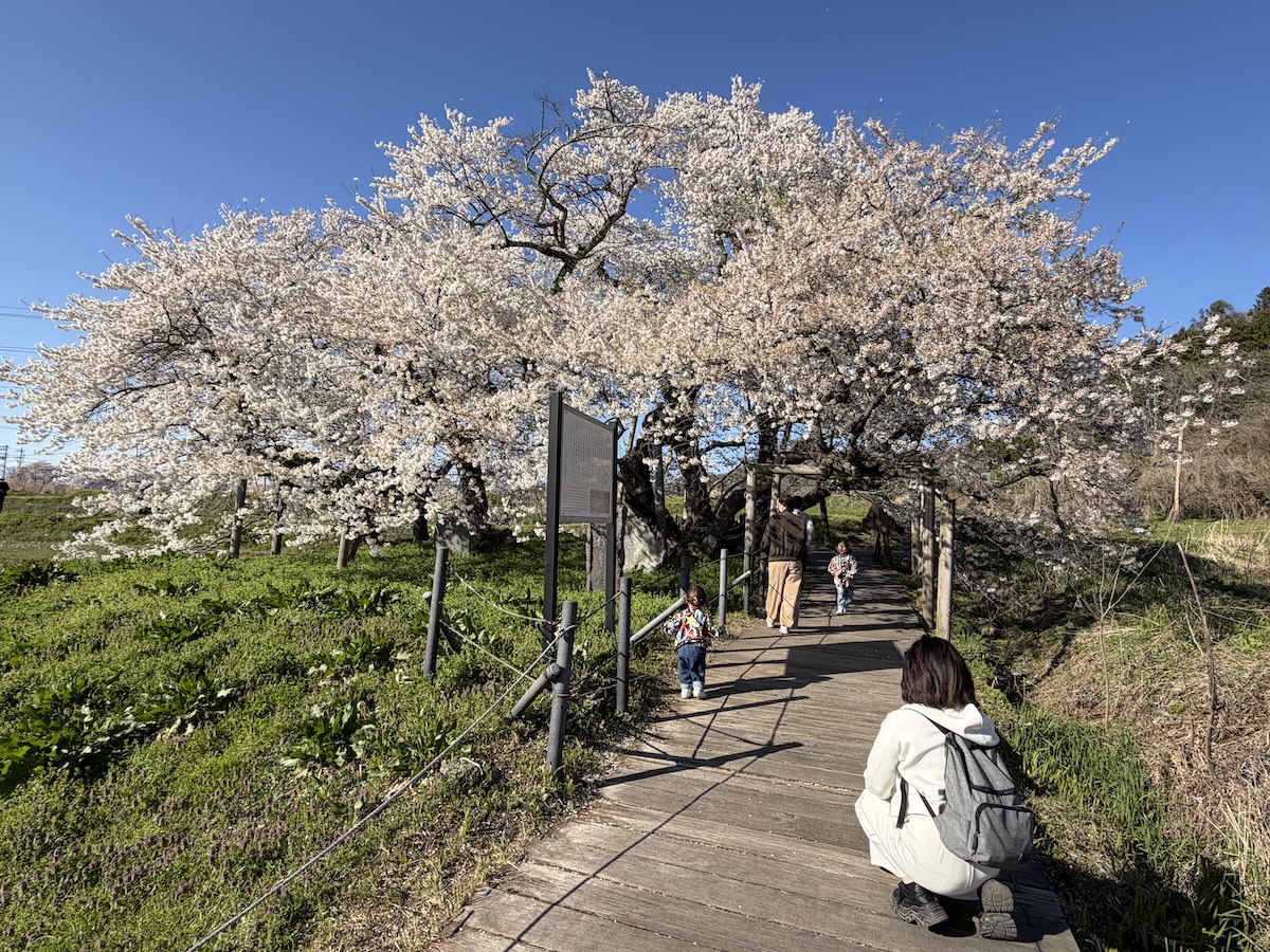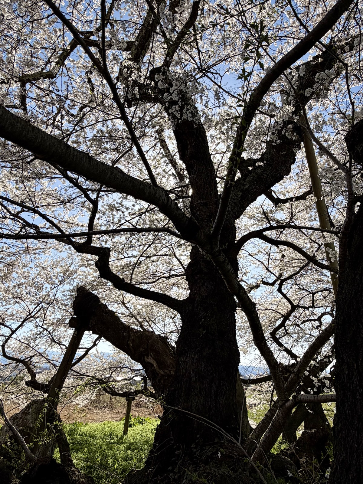 離れた場所から眺めれば、その姿は雄大である。しかし、幹のそばに立ち、見上げると印象は一変する。写真のように、頭上いっぱいに桜の花が広がり、青空とのコントラストがひときわ美しい。