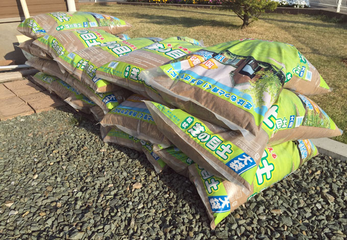 芝生の庭は約20坪あるので、16袋で16坪。表面がかなり傷んだ4坪ほどは、目土を入れず、ゴールデンウィークに張り替えるつもり。