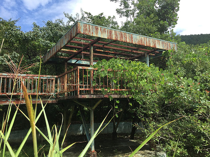 橋を渡ると、櫓のような廃墟があった。周囲の木と一体化、錆びついている。周囲にはベニテングタケの群生が見られた。不気味だ。